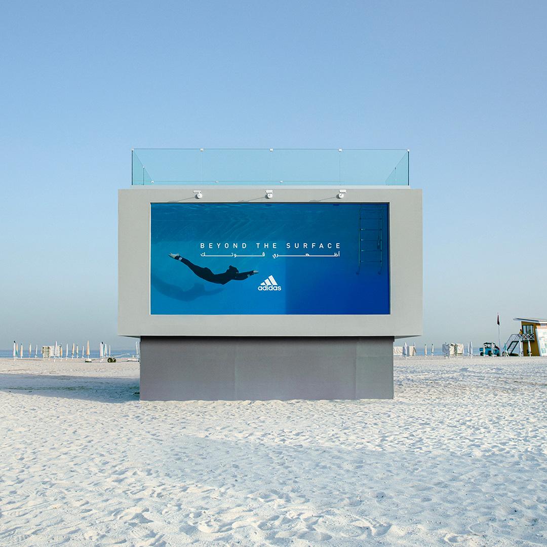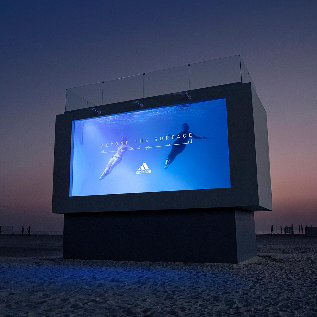The ground-breaking activation, which took place at one of Dubai’s most popular public beaches saw the reveal of an incredible 5-metre high and three-meter deep swimming pool. The liquid billboard could fit around 3,319 adidas shoe boxes and is made of reinforced transparent acrylic. Its walls can hold a whopping 11,500 gallons of water equivalent to nearly 163 bathtubs! The structure took a team of 32 people to build, working around the clock for 3 weeks to deliver.