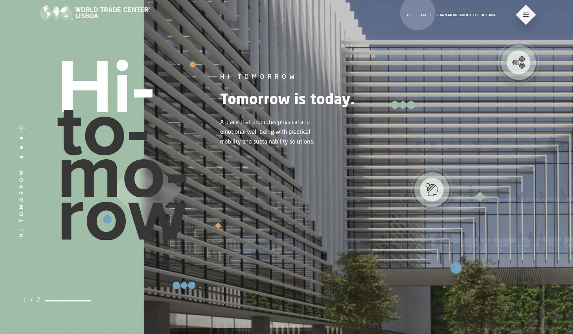 Tanto o site como a brochura digital , que se articulam e complementam, utilizam uma linguagem comum que transmite a forma como todos esses elementos ( espaços. arquitectura, tecnologia ) convivem numa simbiose e equilíbrio perfeito que vêm definir o espaço de trabalho do futuro, traduzido na sua assinatura “Hi Tomorrow”