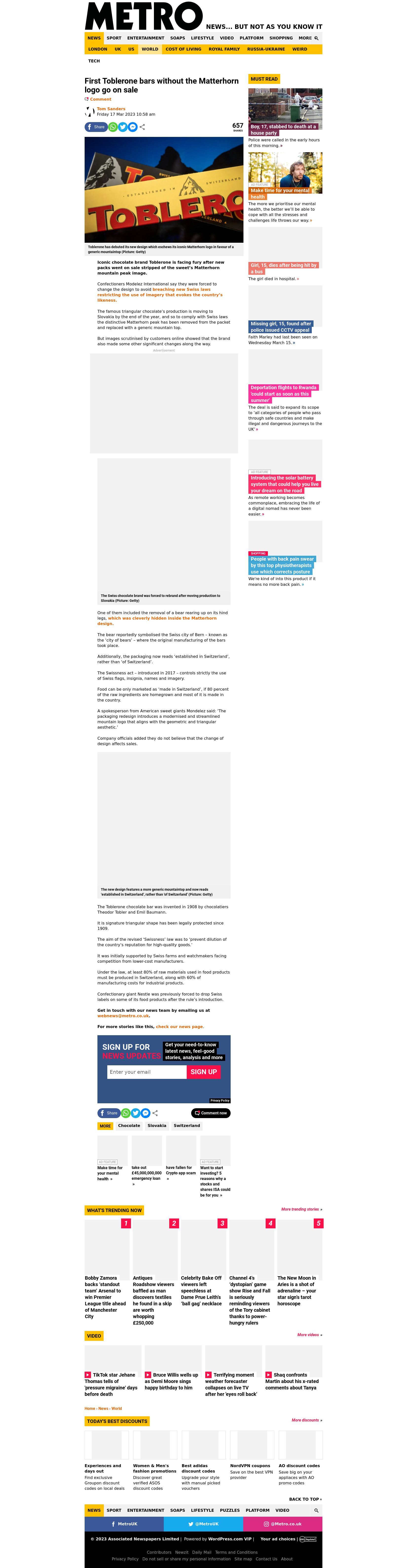 Lei suíça obriga a marca de chocolates Toblerone a mudar de logótipo e publicidade, depois de parte da produção ser aloc...