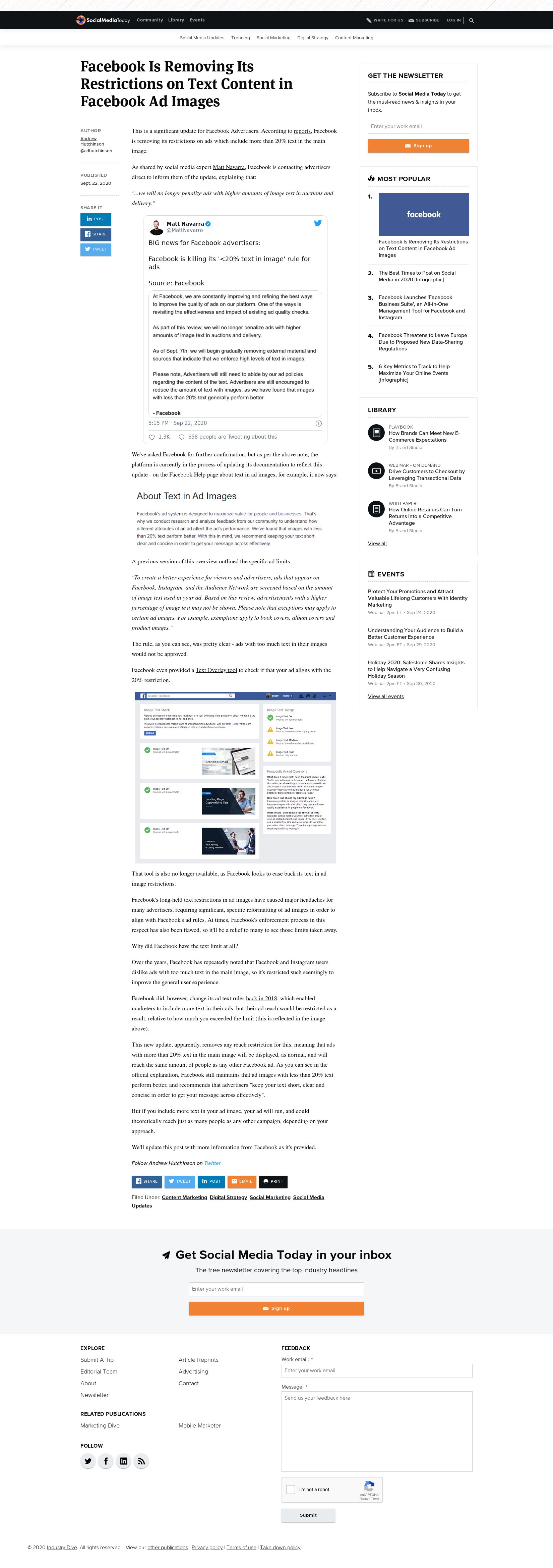 Facebook is removing its restrictions on ads which include too much text in the main ad image.