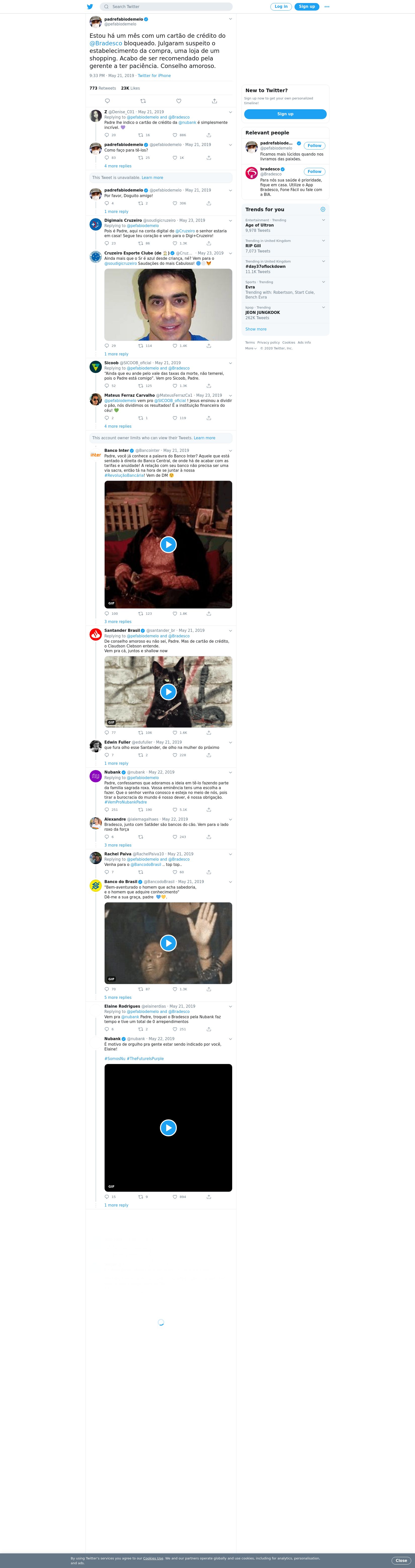 “Estou há um mês com um cartão de crédito do @Bradesco bloqueado. Julgaram suspeito o estabelecimento da compra, uma loja...