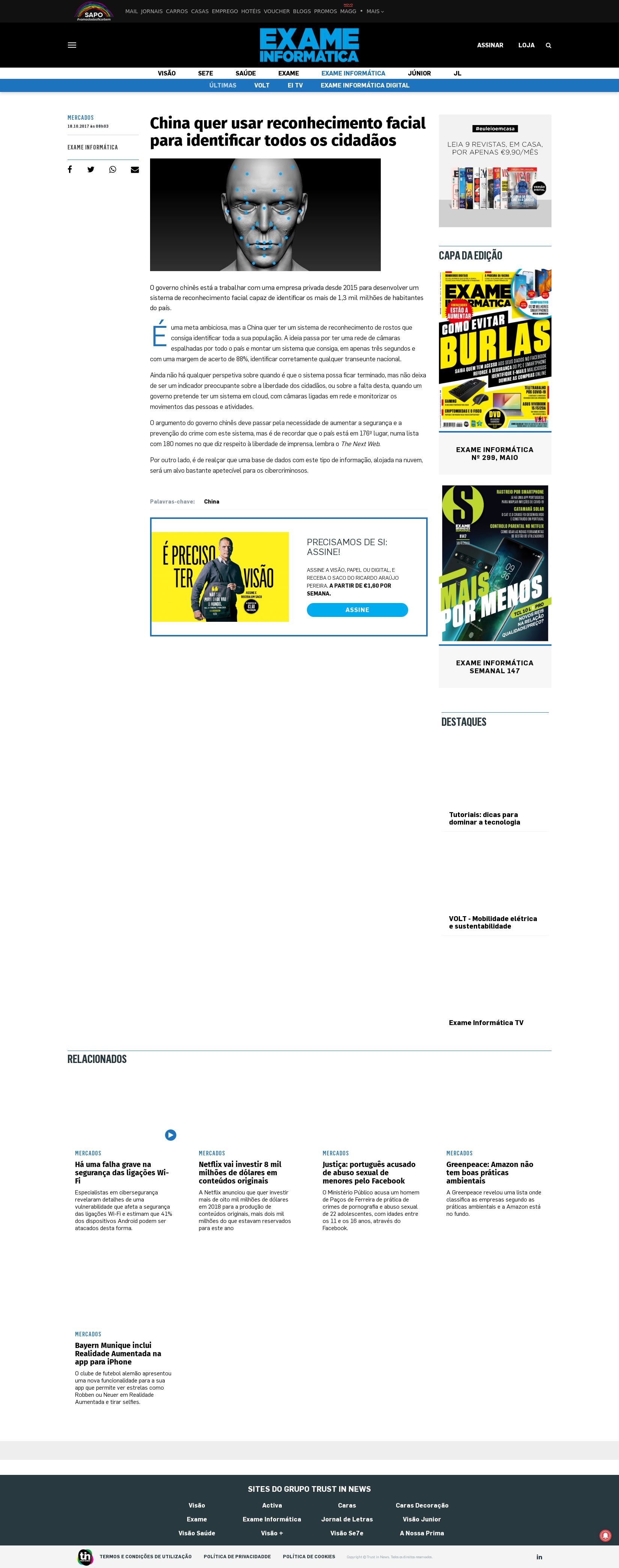 O governo chinês está a trabalhar com uma empresa privada desde 2015 para desenvolver um sistema de reconhecimento facial c...